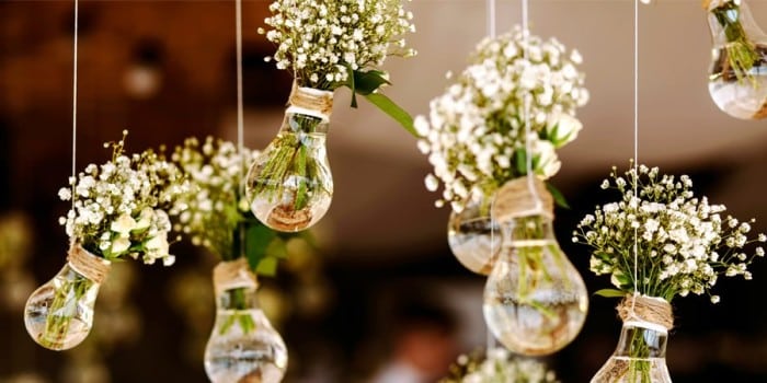 Подвесные элементы в декоре — это стильно, модно и очень красиво! А еще они добавляют любому интерьеру легкости. Сегодня мы расскажем, как украсить вашу свадьбу инсталляциями из цветов и … стеклянных лампочек. Вам понадобятся: Лампочка Узкие плоскогубцы Шпагат или леска Защитные очки (соблюдение техники безопасности перед свадьбой превыше всего!))) Цветы с не слишком крупными бутонами…